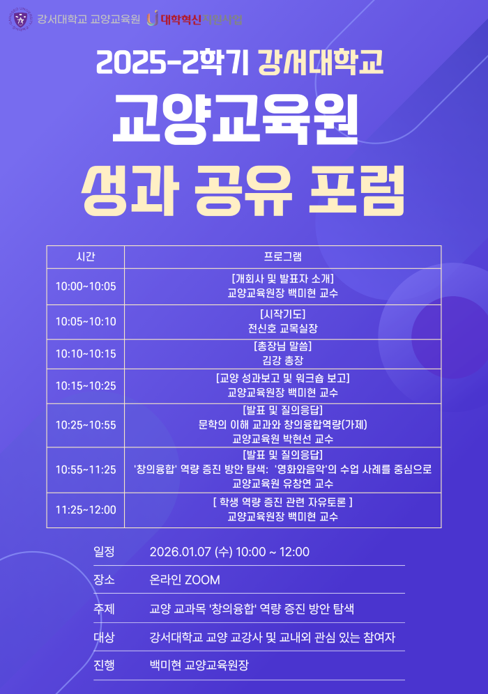 강서대학교 교양교육원에서는 아래와 같이 2025학년도 2학기 강서대학교 역량 기반 교양 교육과정 운영 및 평가를 위한 교양교육원 성과 공유 포럼을 개최합니다. 많은 관심과 참여 부탁드립니다. ■ 행사명: 2025학년도 2학기 강서대학교 역량 기반 교양 교육과정 운영 및 평가를 위한 교양교육원 성과 공유 포럼 ■ 주제 : 교양 교과목 '창의융합' 역량 증진 방안 탐색 ■ 일시 : 2026년 1월 7일(수) 10:00~12:00 ■ 진행 : 온라인(ZOOM) ※ 줌 링크 및 회의 정보는 신청자에 한해 추후 안내 예정 ■ 신청링크: https://forms.gle/repFpHLgvs1gm5817 ※ 원활한 운영을 위해 참석을 희망하시는 경우 2026년 1월 3일(토) 18시까지 사전 신청 부탁드립니다. ■ 주최 : 강서대학교 교양교육원 ■ 세부 일정 : 첨부 포스터 참조 ■ 문의처 : 강서대학교 교양교육원 (Tel. 02-2600-2266 / E-mail. kcula@gangseo.ac.kr)