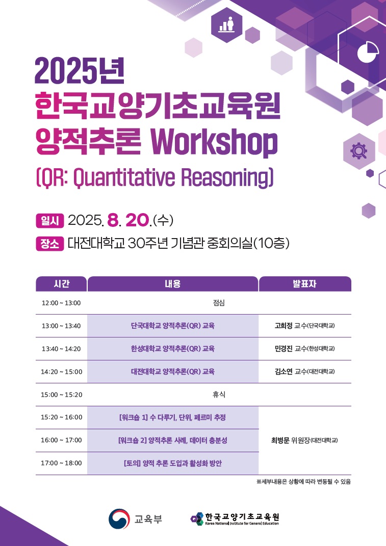2025년 한국교양기초교육원 양적추론(QR: Quantitative Reasoning) 워크숍 | 2025-08-20 | 1464 |