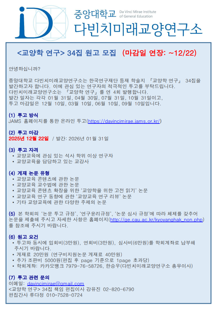 | [중앙대학교] 다빈치미래교양연구소 <교양학 연구> 34집 원고 모집 안내 (마감일 연장: ~12/22) | 2025-11-13 조회수 : 993 |
