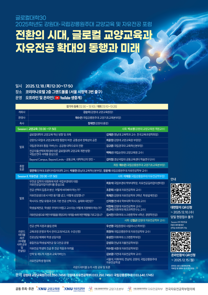 <2025학년도 국립강릉원주대-강원대 교양교육 및 자유전공 포럼> 2026년 3월 통합 강원대학교 출범을 앞두고, 글로컬대학의 교양교육 및 자유전공 혁신 사례를 공유하고 대학 협력 네트워크 강화를 위해 국립강릉원주대 교양기초교육본부·자유전공학부와 강원대 교양교육원· 자유전공학부가 협력하여 <2025학년도 국립강릉원주대-강원대 교양교육 및 자유전공 포럼>을 개최합니다. 관심있는 분들의 많은 참여 바랍니다. 1. 주제: 전환의 시대, 글로컬 교양교육과 자유전공 확대의 동행과 미래 일시: 2025. 12. 18.(목) 12:30~18:00 장소: 코리아나호텔 2층 그랜드볼룸 2층(서울 시청역 3번 출구) 대상: 강원대·국립강릉원주대 및 전국대학(유관기관) 교직원, 학생 참여방법: 오프라인(260여 명) 및 YouTube 생중계 (참가신청 필수) 2. 참여안내 - 오프라인(대면) 사전 참가신청 URL: https://forms.gle/6h1t4qqGWWPrae92A - 온라인(비대면) 사전 참가신청 URL: https://forms.gle/ikg2Y5h8HR7yJLDo8 - 온라인 참가 신창저에 한하여 1~2일 전 유튜브 접속 주소 문자발송 - 참가 확인서 발급 및 자료집 다운로드 안내는 참가 신청자에 한함 ※ 참가신청이 원활하지 않을 경우 포스터 우측 QR 참조 (붙임1) 3. 문의 강원대학교 교양교육원(033-250-7458, kile@kangwon.ac.kr) 강원대학교 자유전공학부(033-250-7450, fair4park@kangwon.ac.kr) 국립강릉원주대학교 교양기초교육본부(033-640-1745, leeky@gwnu.ac.kr)