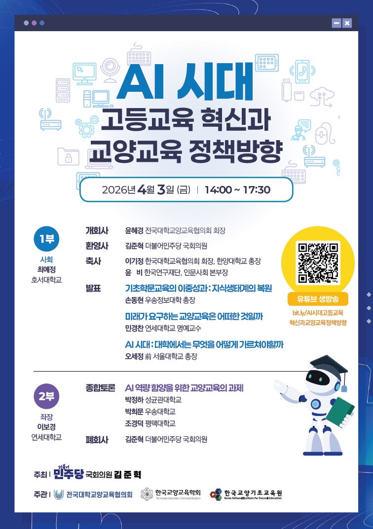 | [안내] 「AI 시대 고등교육 혁신과 교양교육 정책방향」국회 포럼(4.3.) 공동 개최 | 2026-03-23 조회수 : 37 |